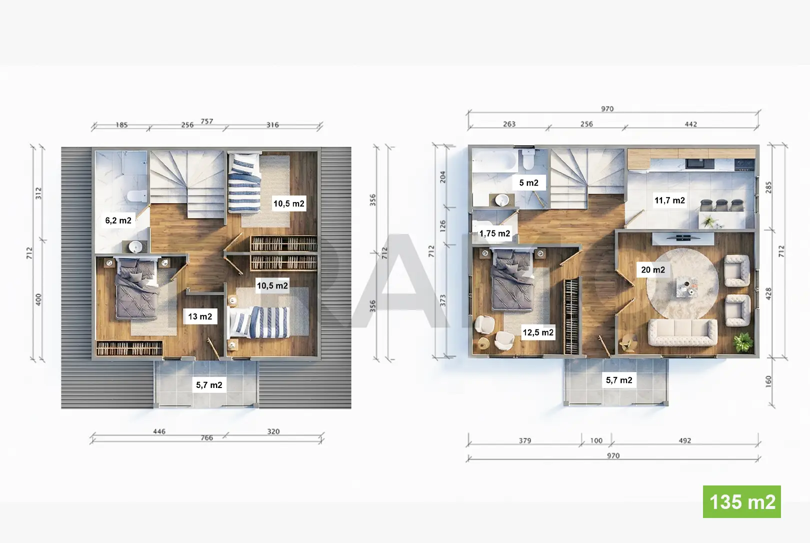 Pramo Prefabrik Yapı Teknolojileri tarafından özel olarak tasarlanan 135 m² Çift Katlı Prefabrik Ev, ferah iç tasarımı, çok amaçlı oda düzeni ve estetik dış cephesiyle çağdaş yaşamın tüm ihtiyaçlarına cevap verir. İki katlı yapısı sayesinde yaşam alanları fonksiyonel olarak ayrılırken, kullanıcıya hem genişlik hem de kullanım kolaylığı sağlar.