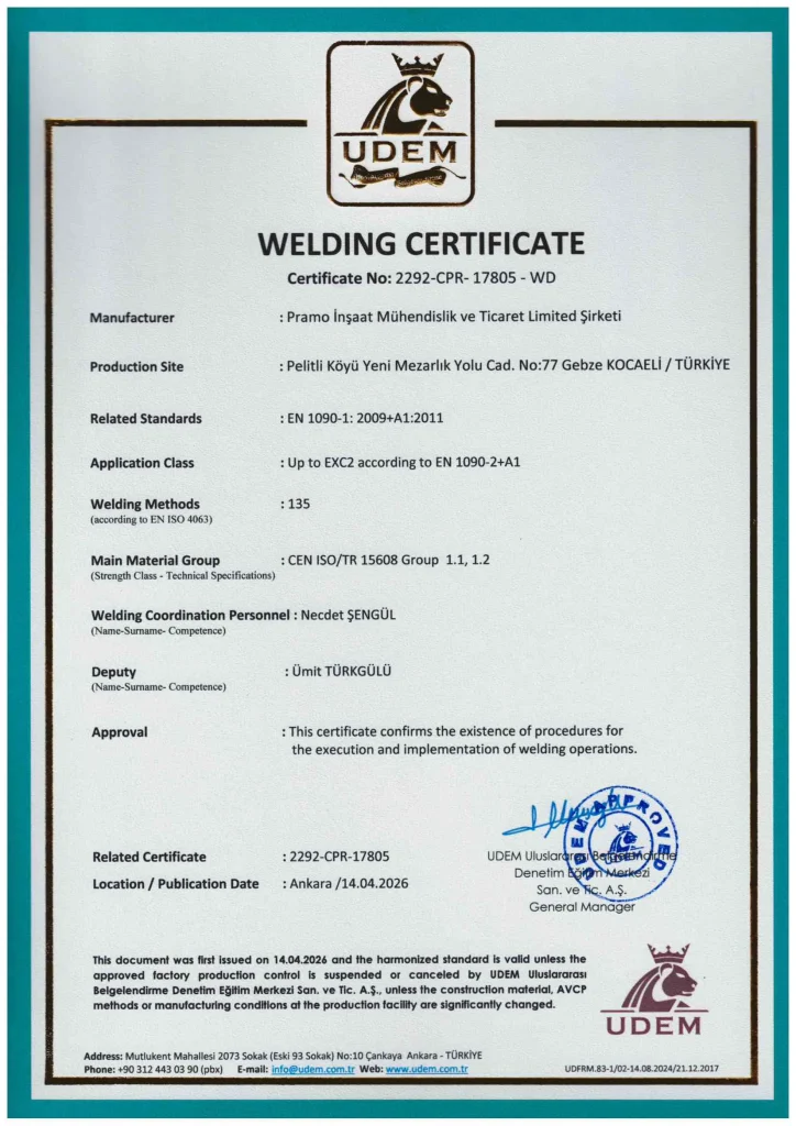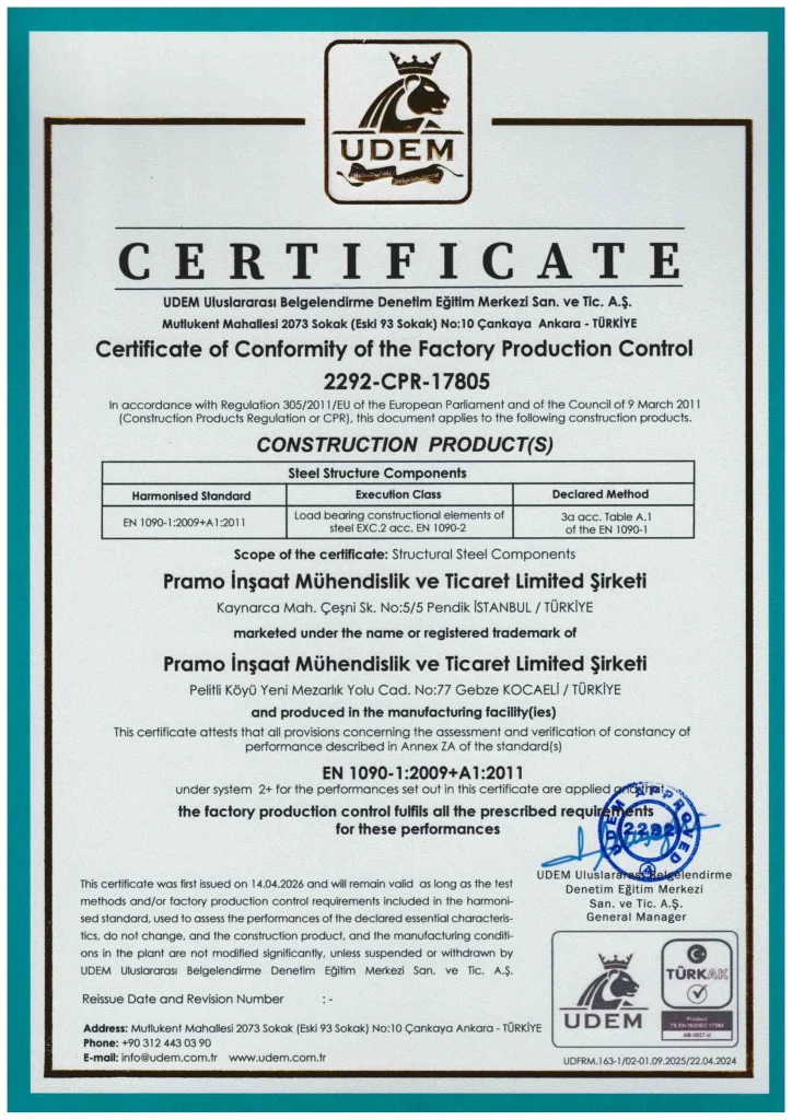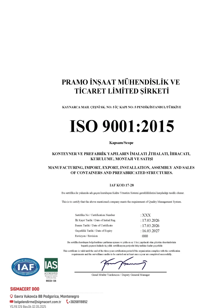 Pramo’da her yapı, yalnızca tasarım ve üretim gücüyle değil; belgelendirilmiş kalite anlayışıyla da şekillenir. Bu sayfada yer alan Pramo sertifikaları ve kalite belgeleri, üretim süreçlerimizin uluslararası standartlara uygunluğunu; malzeme seçimi, işçilik, süreç kontrolü ve güvenlik adımlarımızın düzenli olarak denetlendiğini gösterir. Amacımız, her projede aynı kalite seviyesini koruyarak uzun ömürlü ve güven veren yaşam alanları sunmaktır.
